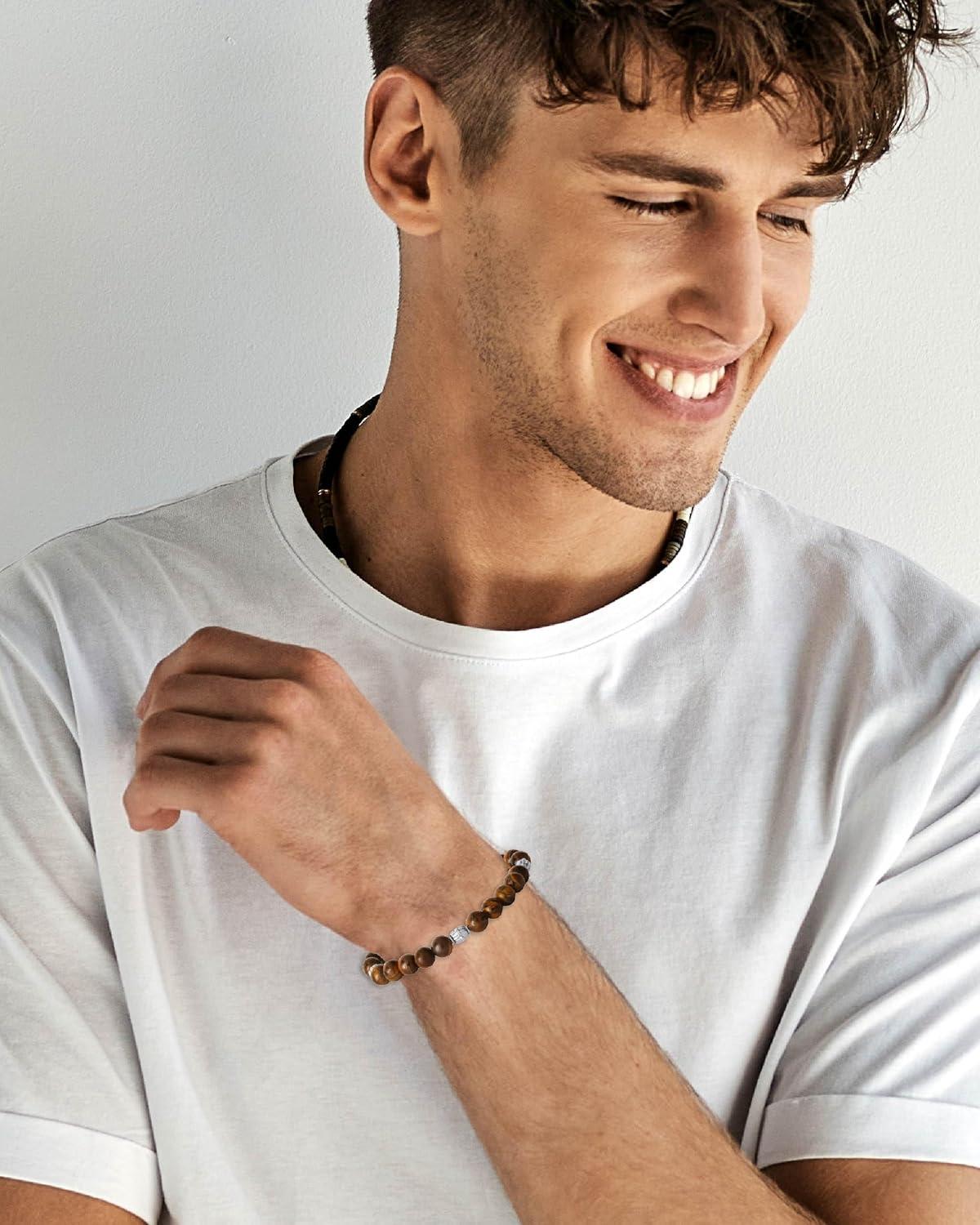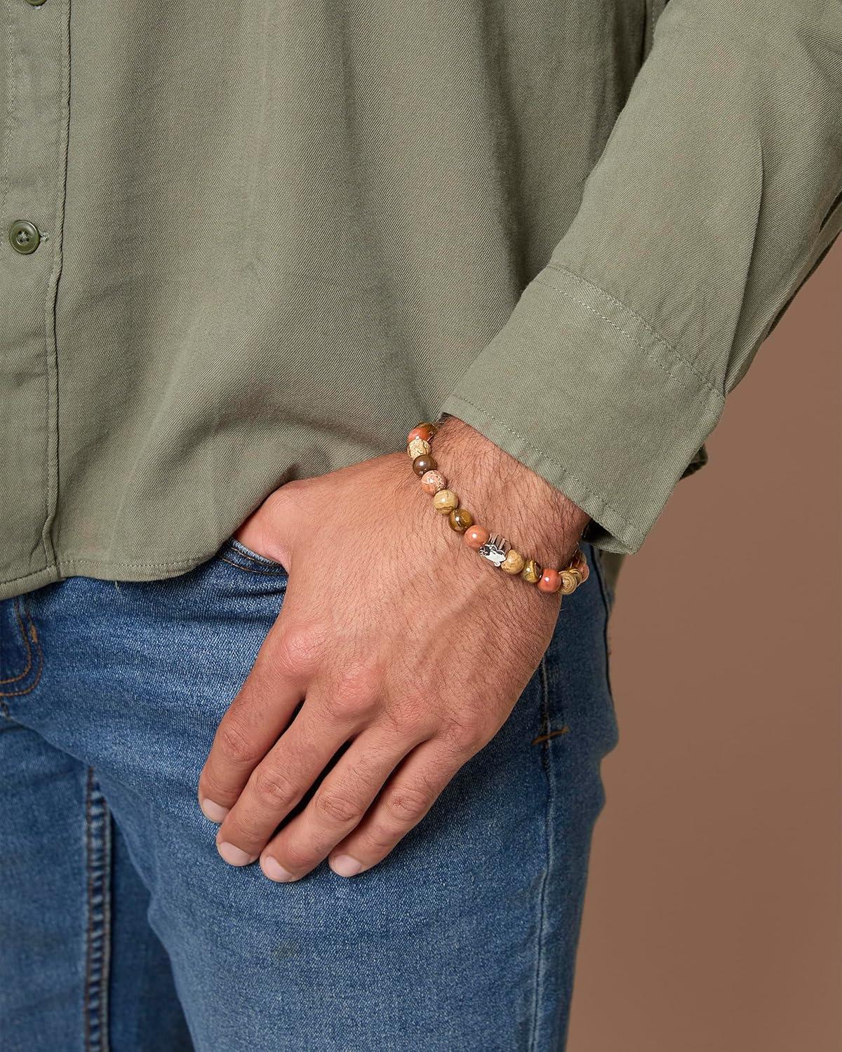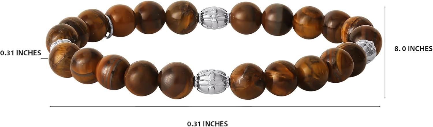 Lucky Brand Tiger Eye Bracelet for Men, Silver Flash-Plated Brass and Tiger’s Eye Bead Bracelet, Stretch Beaded Bracelet