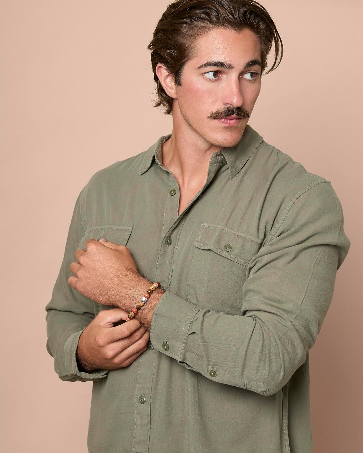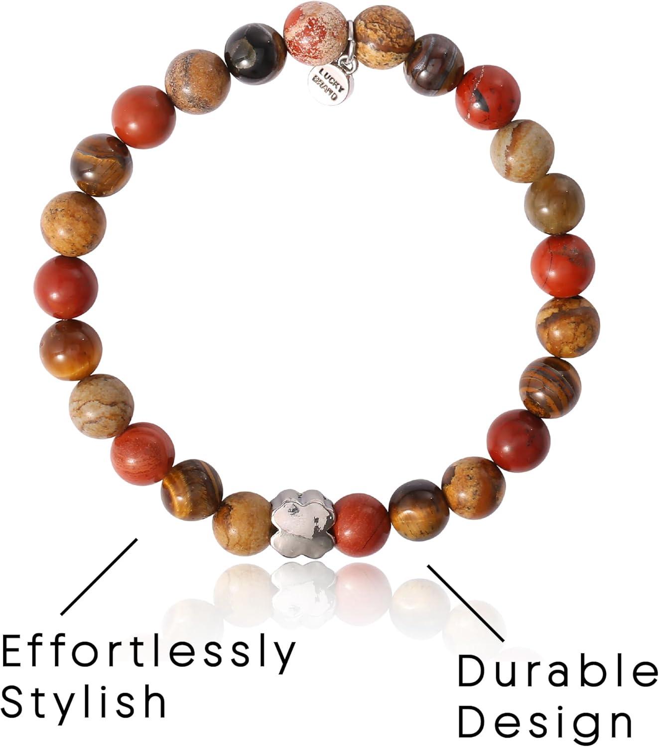 Lucky Brand Red Jasper Mens Bracelet, Stretch Beaded Bracelet for Men with CloverLogo and Jasper Beads