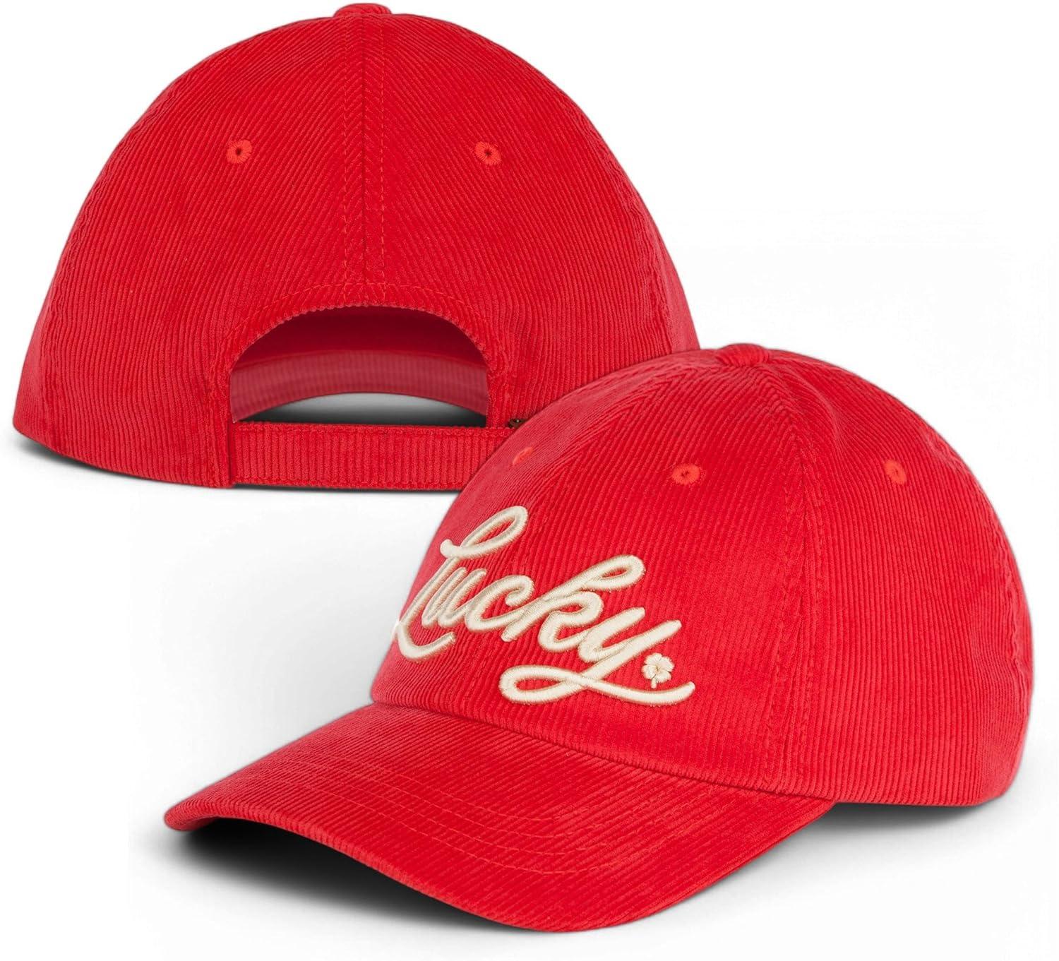Lucky Brand Classic Cotton Hat | Adjustable | Dad Hat | Baseball Cap | Golf | Fishing | Low Profile | 5 Panel Design(Script Corduroy – Red)