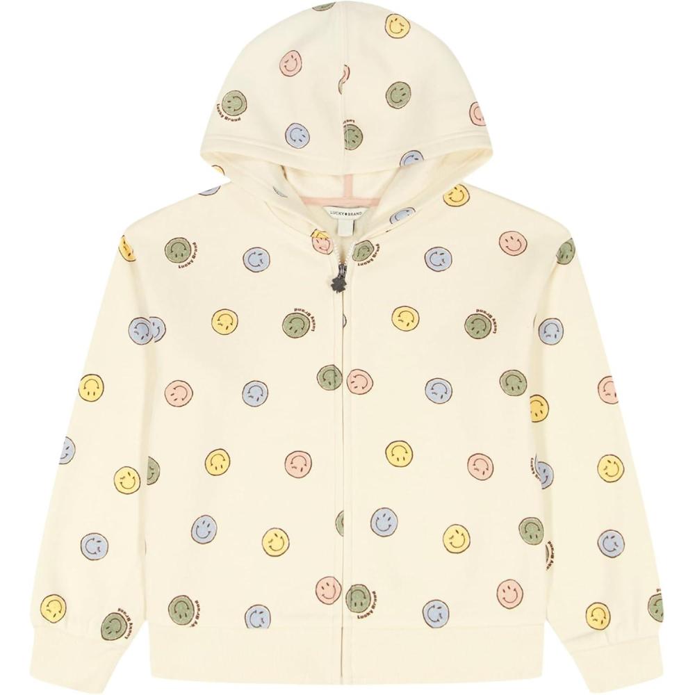 Lucky Brand Girls’ Long Sleeve Fleece Full Zip Hoodie with Ribbed Cuffs & Waist(Egret Smileys)