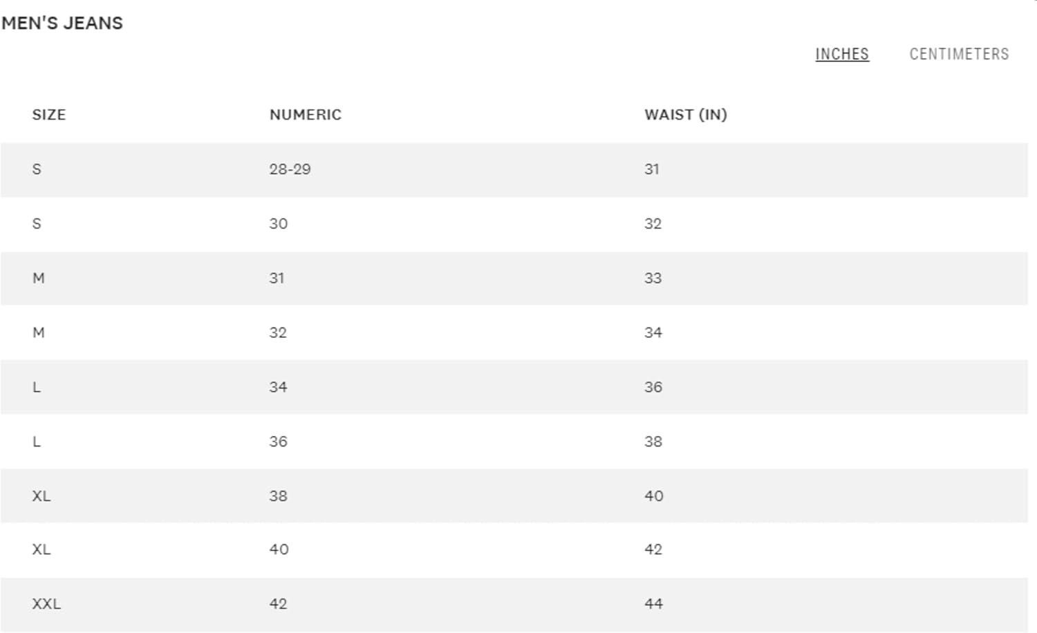 | Size | 28, 29, 29W x 30L, 29W x 32L, 29W x 34L, 30, 30W x 29L, 30W x 30L, 30W x 31L, 30W x 32L, 30W x 34L, 30W x 42L, 31, 31W x 30L, 31W x 32L, 31W x 34L, 32, 32 x 40, 32W x 28L, 32W x 29L, 32W x 30L, 32W x 31L, 32W x 32L, 32W x 34L, 32W x 42L, 33, 33W x 30L, 33W x 32L, 33W x 34L, 34, 34 x 42, 34W x 28L, 34W x 29L, 34W x 30L, 34W x 32L, 34W x 33L, 34W x 34L, 34W x 40L, 36, 36W x 28L, 36W x 29L, 36W x 30L, 36W x 31L, 36W x 32L, 36W x 33L, 36W x 34L, 36W x 40L, 36W x 42L, 38, 38 x 42, 38W x 28L, 38W x 29L, 38W x 30L, 38W x 31L, 38W x 32L, 38W x 33L, 38W x 34L, 40, 40W x 30L, 40W x 32L, 40W x 34L, 42, 42W x 30L, 42W x 32L, 42W x 34L |