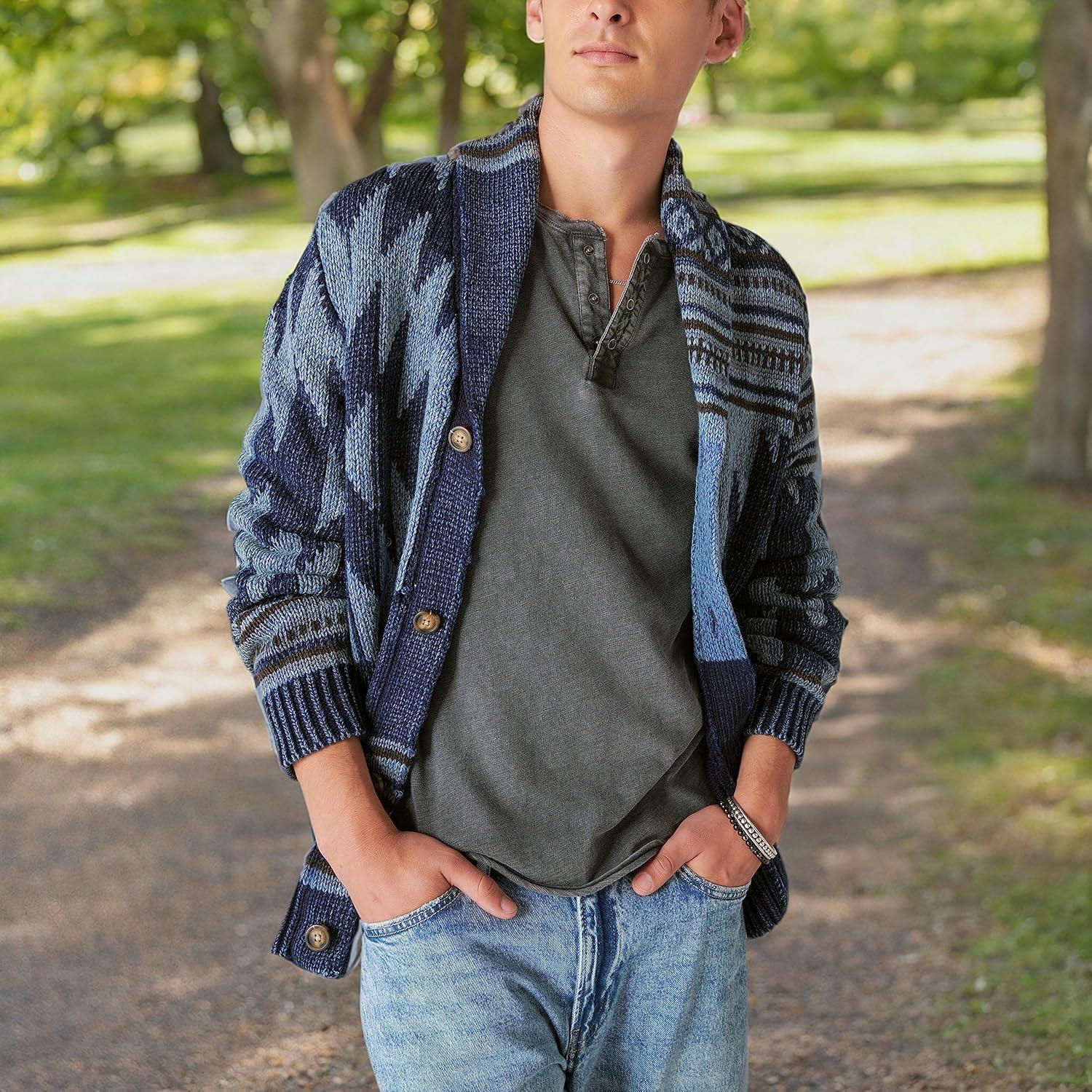 Lucky Brand Men’s Southwestern Print Shawl Cardigan(Dark Denim Combo)