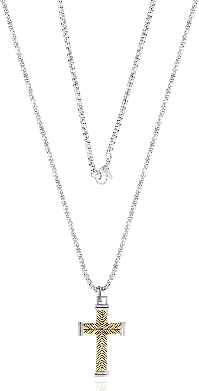 Lucky Brand Stainless Steel Cross Necklace for Men 24″”, Two-Tone Cross Pendant Necklace, Cross Jewelry