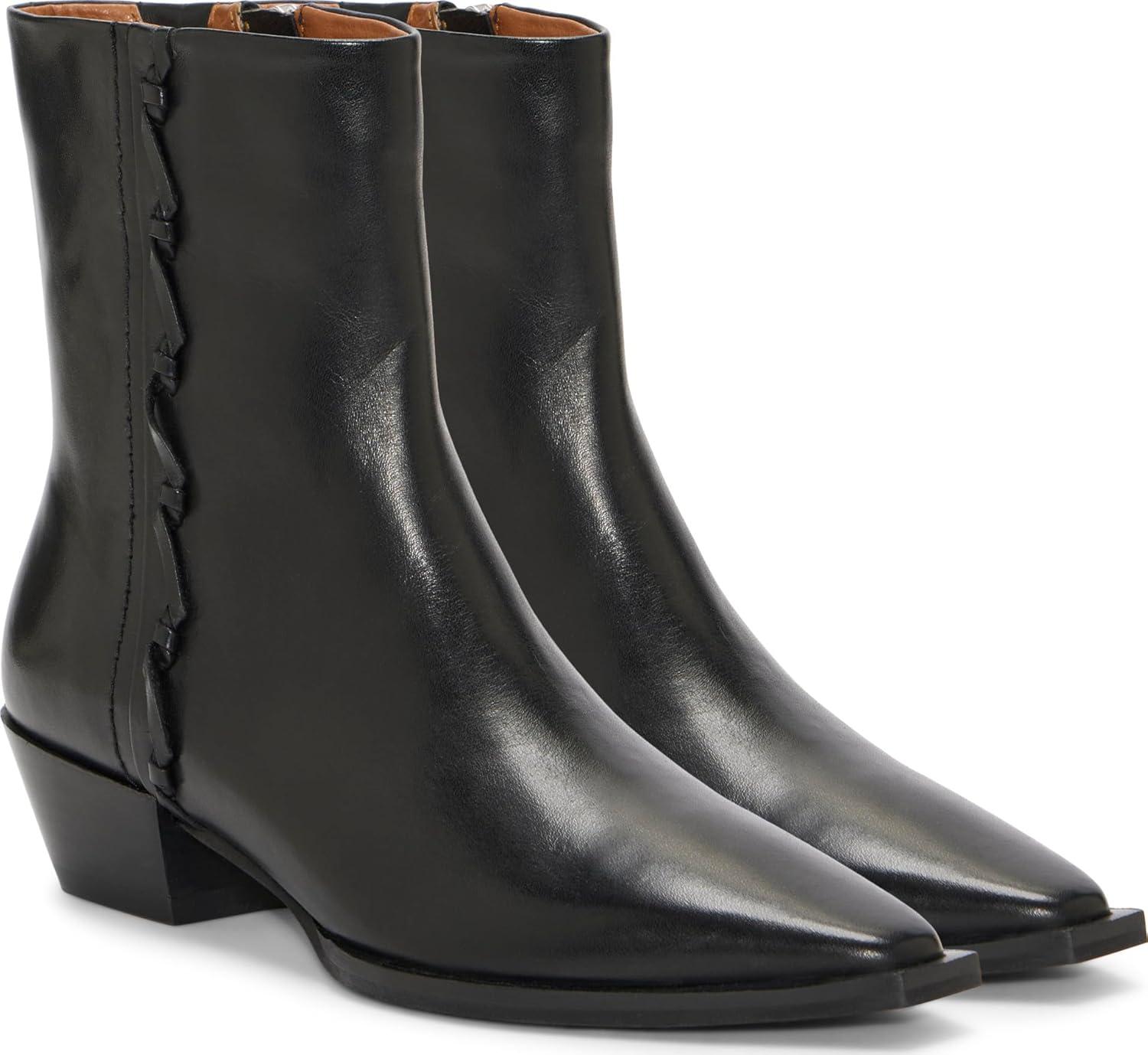 Lucky Brand takes a feminine and tailored turn in booties with the Shakell. This dress bootie is detailed to perfection with a smooth leather, snip toe, inside zip, outside detailing and shaft hight just under the calf.