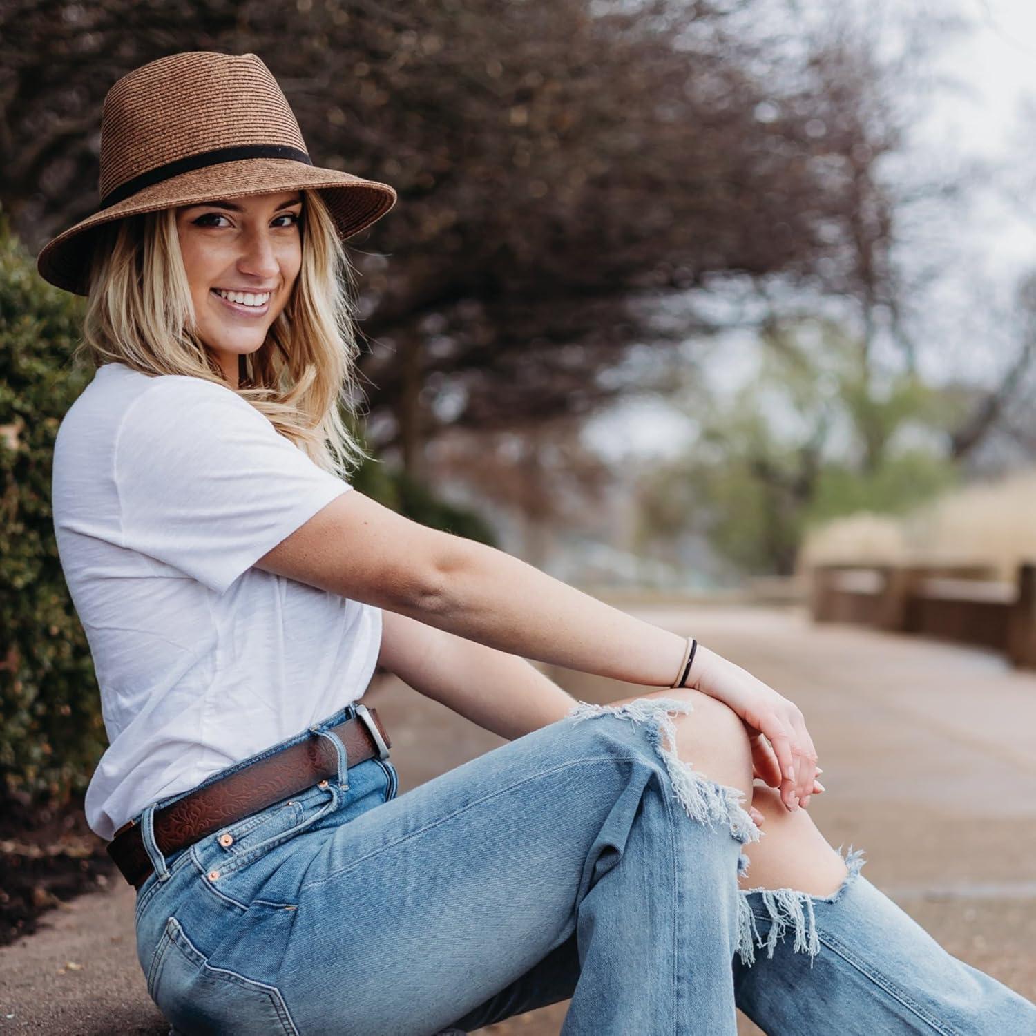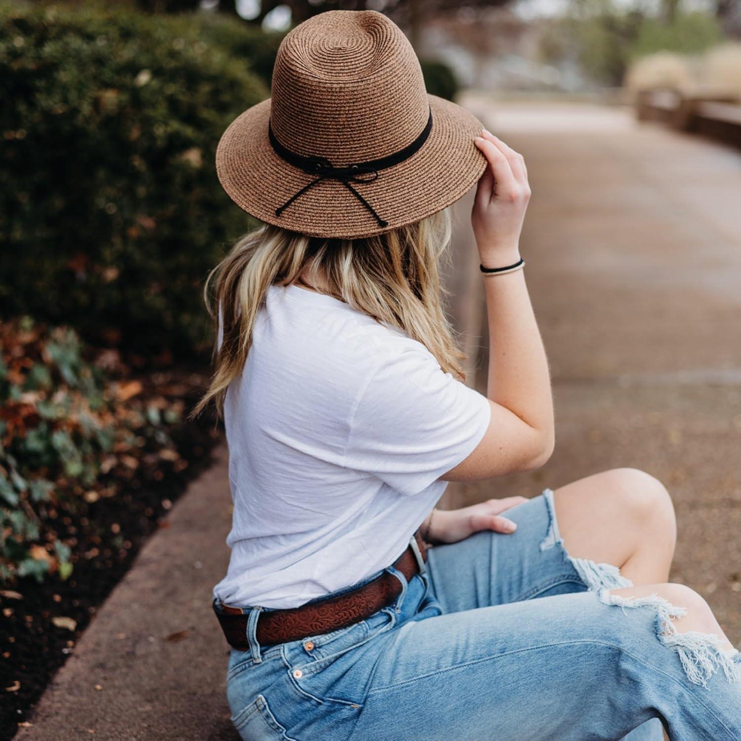 Lucky Brand Womens Summer Straw Wide Brim Boater Panama Adjustable Hat (One Size Fits Most)(Leather Tie – Gray)
