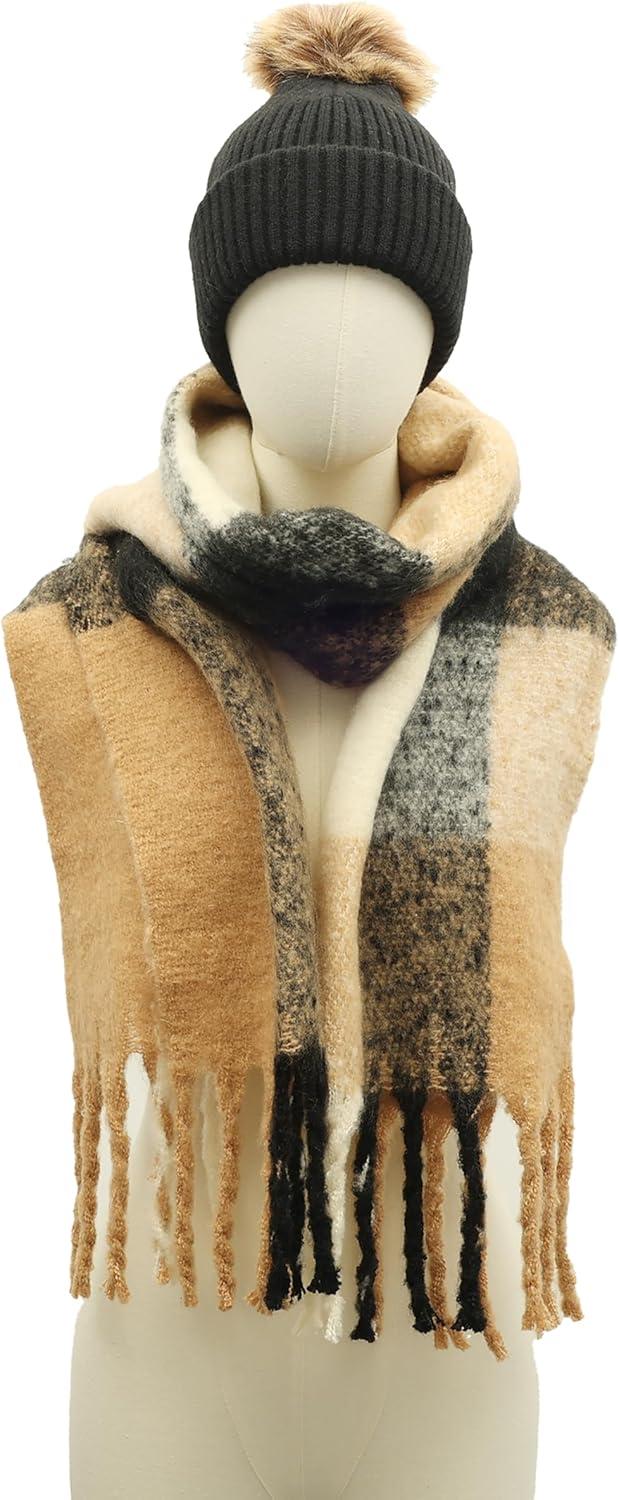 Lucky Brand womens Woven Check Scarf and Pom Hat Set- Boxed(Black)